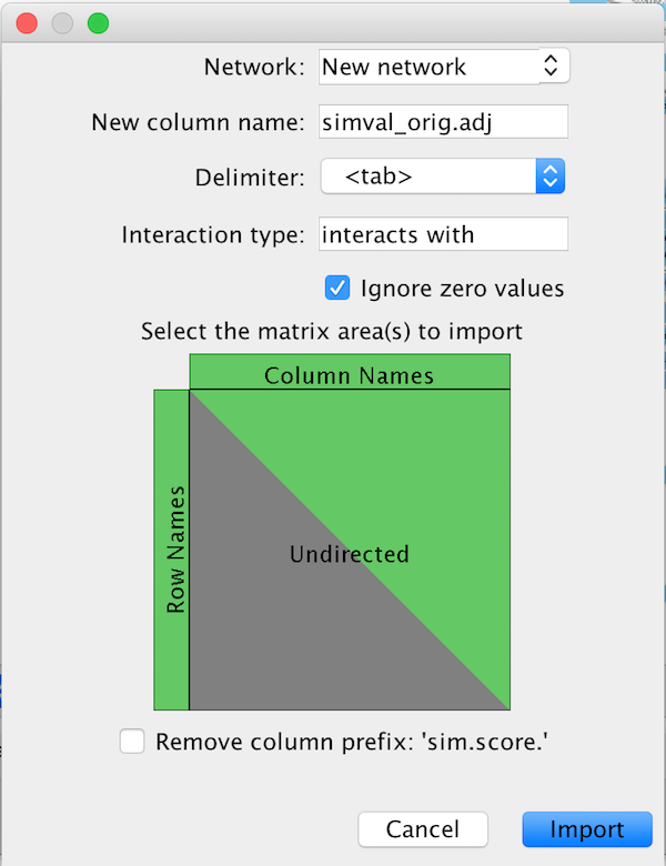 aMatReader is a Cytoscape core app that augments the Cytoscape network readers by adding the ability to read in adjacency matrix file(s). If importing with drag'n'drop or the File>Import>Network, the input file must have the ".mat" or ".adj" extension to avoid conflict with other readers. Missing data is assumed to indicate that no edge exists between two nodes. There is no assumption that the nodes defined in the header row and the nodes defined in each data row are in the same order or are matching. Try importing multiple matrix files simultaneously!