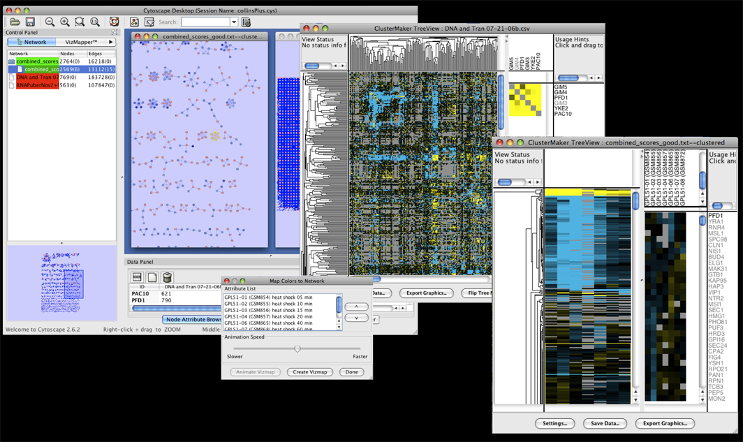 The clusterMaker Cytoscape app unifies different clustering techniques and displays into a single interface. Current clustering algorithms include hierarchical, k-medoid, AutoSOME, and k-means for clustering expression or genetic data; and MCL, transitivity clustering, affinity propagation, MCODE, community clustering (GLAY), SCPS, and AutoSOME for partitioning networks based on similarity or distance values. Hierarchical, k-medoid, AutoSOME, and k-means clusters may be displayed as hierarchical groups of nodes or as heat maps. All of the network partitioning cluster algorithms create collapsible "meta nodes" to allow interactive exploration of the putative family associations within the Cytoscape network, and results may also be shown as a separate network containing only the intra-cluster edges, or with inter-cluster edges added back.